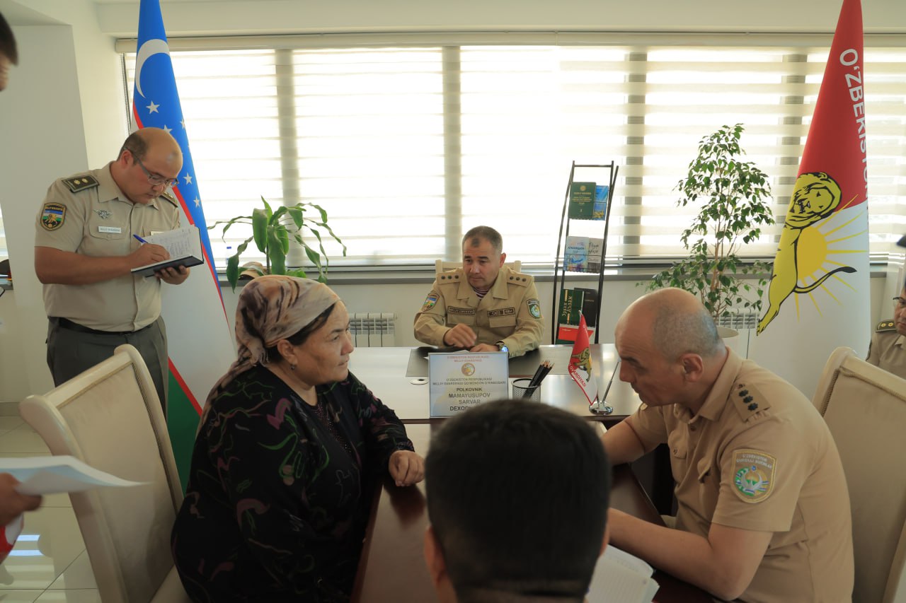 Xususan, Milliy gvardiya qo‘mondoni o‘rinbosari polkovnik S.D.Mamayusupov tomonidan poytaxtimizda joylashgan Milliy gvardiya bo‘linmalarida xizmat qilib kelayotgan harbiy xizmatchi va xodimlar, ularning oila aʼzolari, faxriylar, shuningdek, fuqarolarning turli yo‘nalishdagi murojaatlari tinglandi va mavjud muammoli masalalar masʼullar ishtirokida ko‘rib chiqildi. Asosiy eʼtibor murojaatlarni o‘z vaqtida qonuniy hal etishga qaratilib, mutasaddilarga topshiriqlar berildi va ijrosi nazoratga olindi.