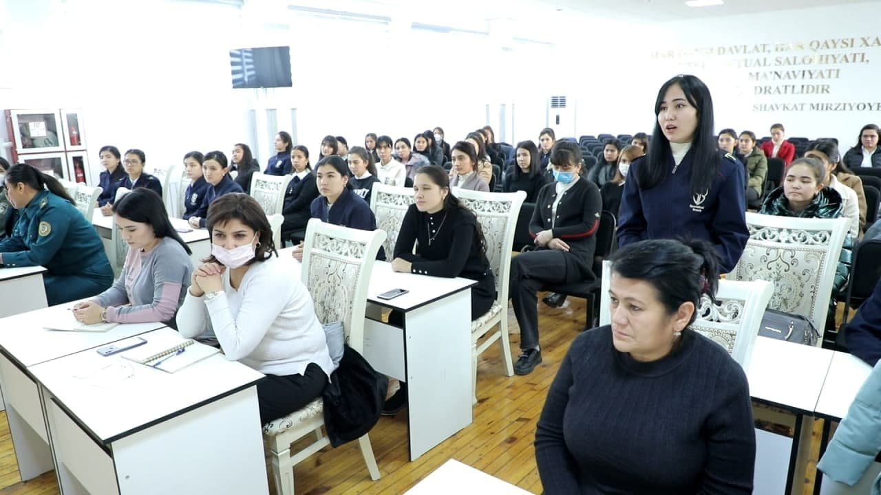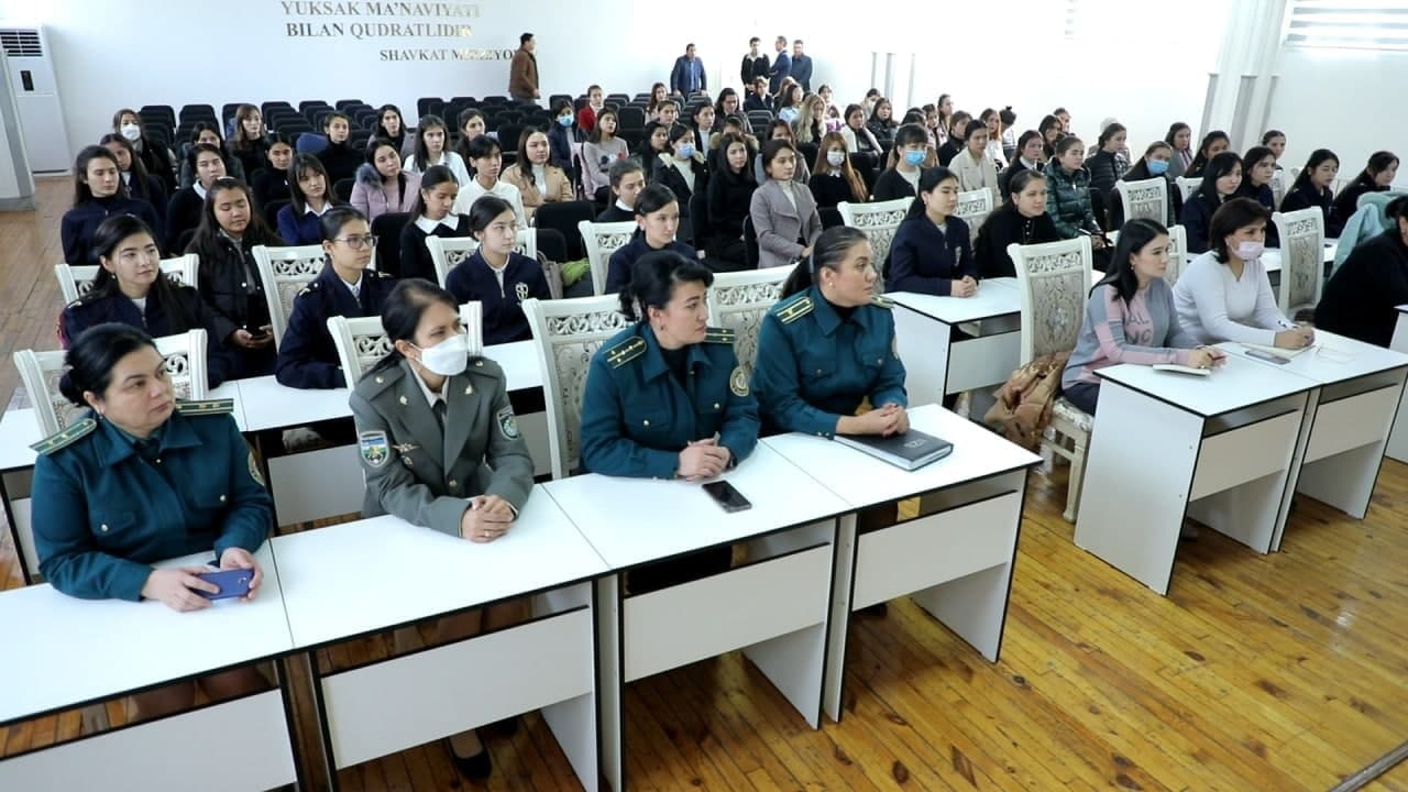 Yosh avlodda xizmatga bo‘lgan qiziqishlarini orttirish, o‘z kasbiga bo‘lgan ishtiyoqini oshirish, tizimlarda amalga oshirilayotgan islohotlar, xizmat faoliyatini belgilab beruvchi hukumat farmon va qarorlarining, vazirliklarning buyruq va boshqa normativ-huquqiy hujjatlarining mazmun-mohiyatini tushuntirish maqsadida Toshkent davlat yuridik universitetining Ixtisoslashtirilgan filialida Ichki ishlar vazirligi va Milliy gvardiya tizimida faoliyat yuritayotgan ayol ofitser xodimalari ishtirokida “Huquqni muhofaza qiluvchi organlarda ayollarni o‘rni” mavzusida davra suhbati bo‘lib o‘tdi.